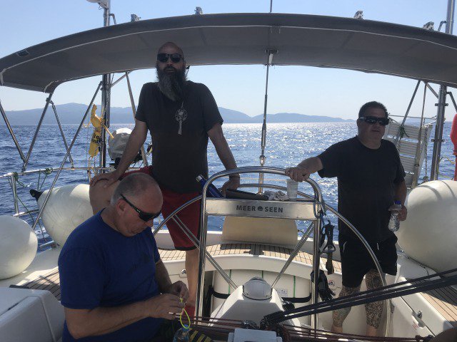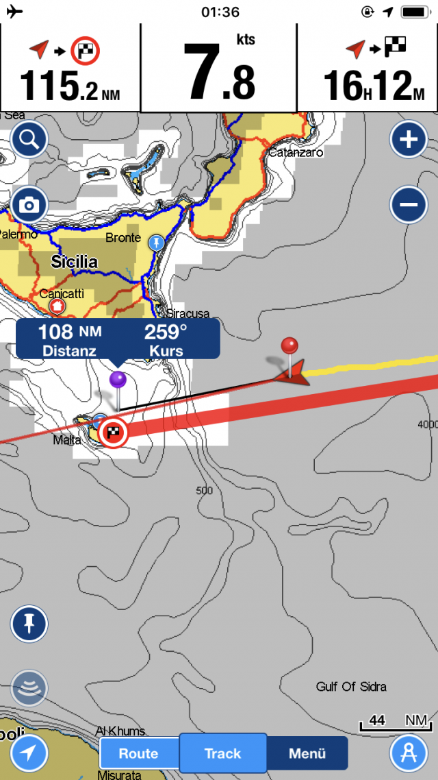 Die mittelfristige Windvorhersage lässt uns leider keinen Tag länger in Griechenland weilen... Freitag früh geht der Anker hoch, vorbei am historischen Methoni Fort Kurs 250 Grad... wir nehmen bei nördlichen Winden mit vorhergesagter W-Drehung 270 Grad und ab geht der Ritt. Abends gibt’s deftigen selbst gemachten Kalbs-Gulasch. Im 2-er Wachsystem á 3 Segler gehen so ziemlich alle Am-Wind Segel hoch und runter, die an Bord sind. Genua-Fock-Genua. Welle 1,5-2 Meter gemäßigt aus NW, einige Brecher schickt uns Italien, aber alles gut zu händeln, der Rumpf der 47.7 passt da anständig rein. Viel Schiffsverkehr aber dank AIS wurde nicht ein Ausweichmanöver nötig und so geht es eher unspektakulär zwischen 5,5 und 8,5 Knoten Speed mit Kurs SE Sizilien im Luv Bogen in die Nacht. Mitternacht haben wir etwas über 80 Meilen auf der Uhr, der Wind nimmt zu und mit 1. Reff und Fock wird es sportlich fix. Samstag wird im Wachsystem weiter gesegelt, gegen Nachmittag lockt Kaffee mit griechischem Kuchen, später dann noch ein Pasta Gericht alle Segler ins Cockpit. Das Boot rauscht durchs Ionische Meer. Immernoch kommt vergleichsweise für das offene Seegebiet wenig Wasser über. Das Etmal (Strecke in 24h) liegt bei 150 Seemeilen, 100% unter Segel – das sind im Schnitt über die 24h Samstag 6,25 Knoten.