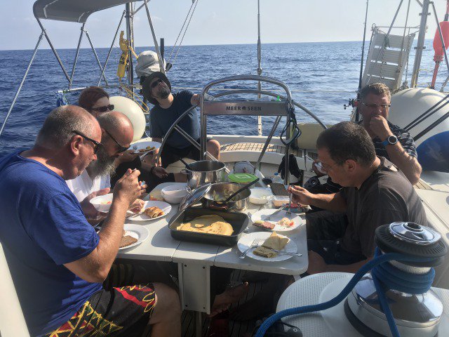 Der Sonntag beginnt etwa 100 sm vor Portopalo / SE Sizilien, 130 sm vor Malta unter voller Besegelung mit Großsegel und Genua in leichtem Schrick in den Schoten, der Wind dreht zu unserer Freude entgegen der westlichen Vorhersage doch N-lich. Aber nimmt auf 3 Bft ab mit zum Glück passendem Strom und Welle, so dass wir noch zwischen 4-5 Kn laufen, bis gegen 16 Uhr der Wind einschläft und uns bei 3.500 m Wassertiefe zum Baden neben einer Delfinschule einlädt. Bis jetzt sind 314 Seemeilen gesegelt. Was soll´s; beeinflussen können wir es nicht also Maschine an und Kombüsen Wache beginnt damit, Saure Eier handmade zu kochen.