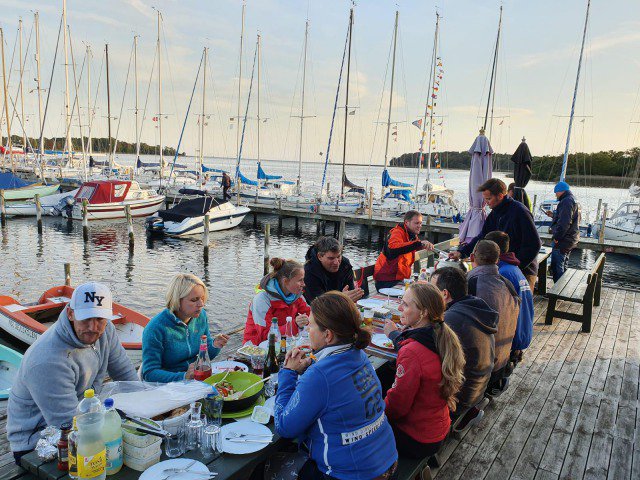 Dort erwartet die Segler bei LiveMusik ein selfemade BBQ und der eine oder andere Willkommenstrunk, bevor am Sonntag die Meute unter MEER-SEEN interner Rückreise Regatta den Heimweg antritt. Am Sonntag ging es dann bei ordentlich Druck in der Hütte bei über 30 Kn Wind die 30 sm zurück nach Warnemünde.