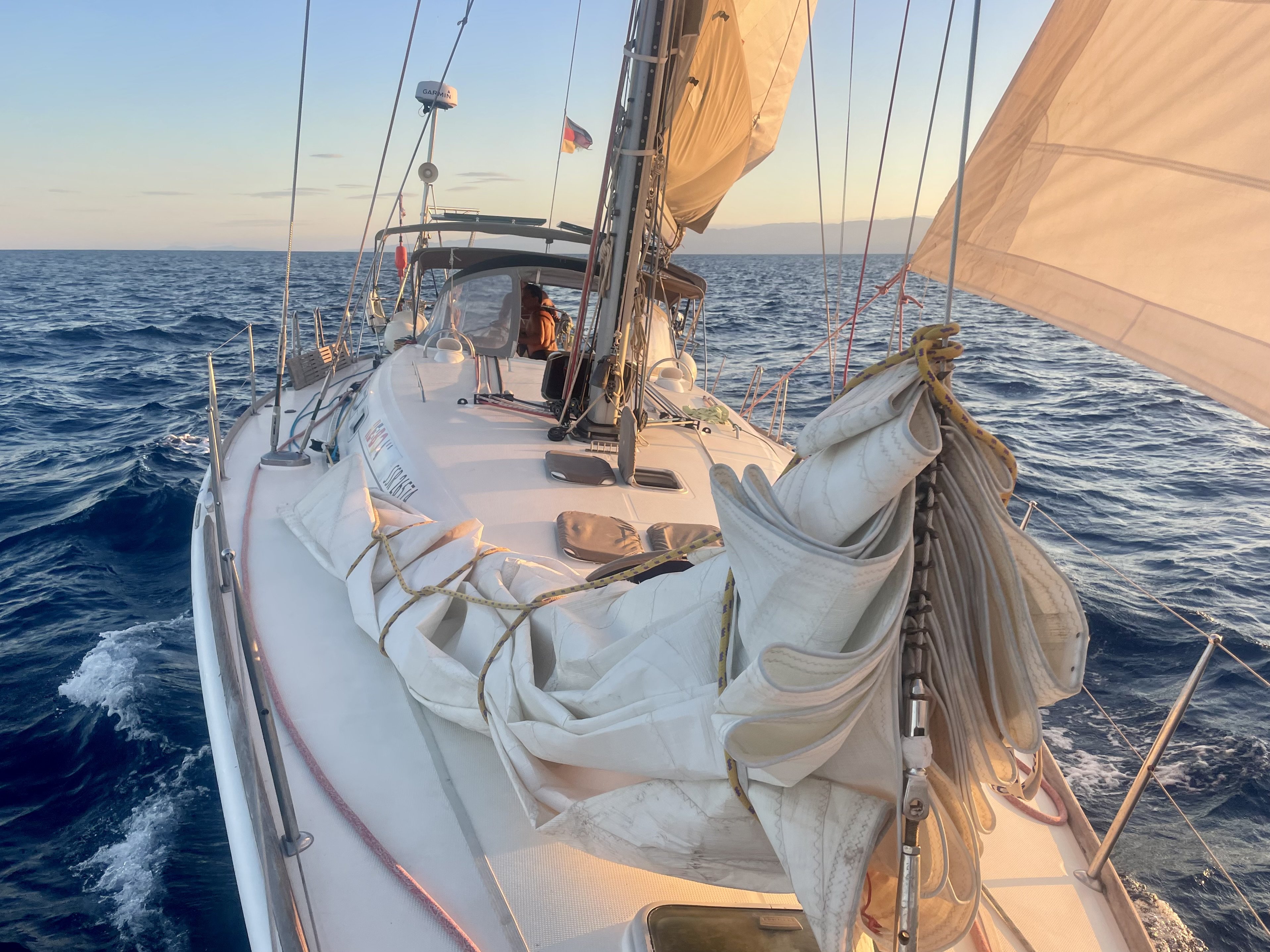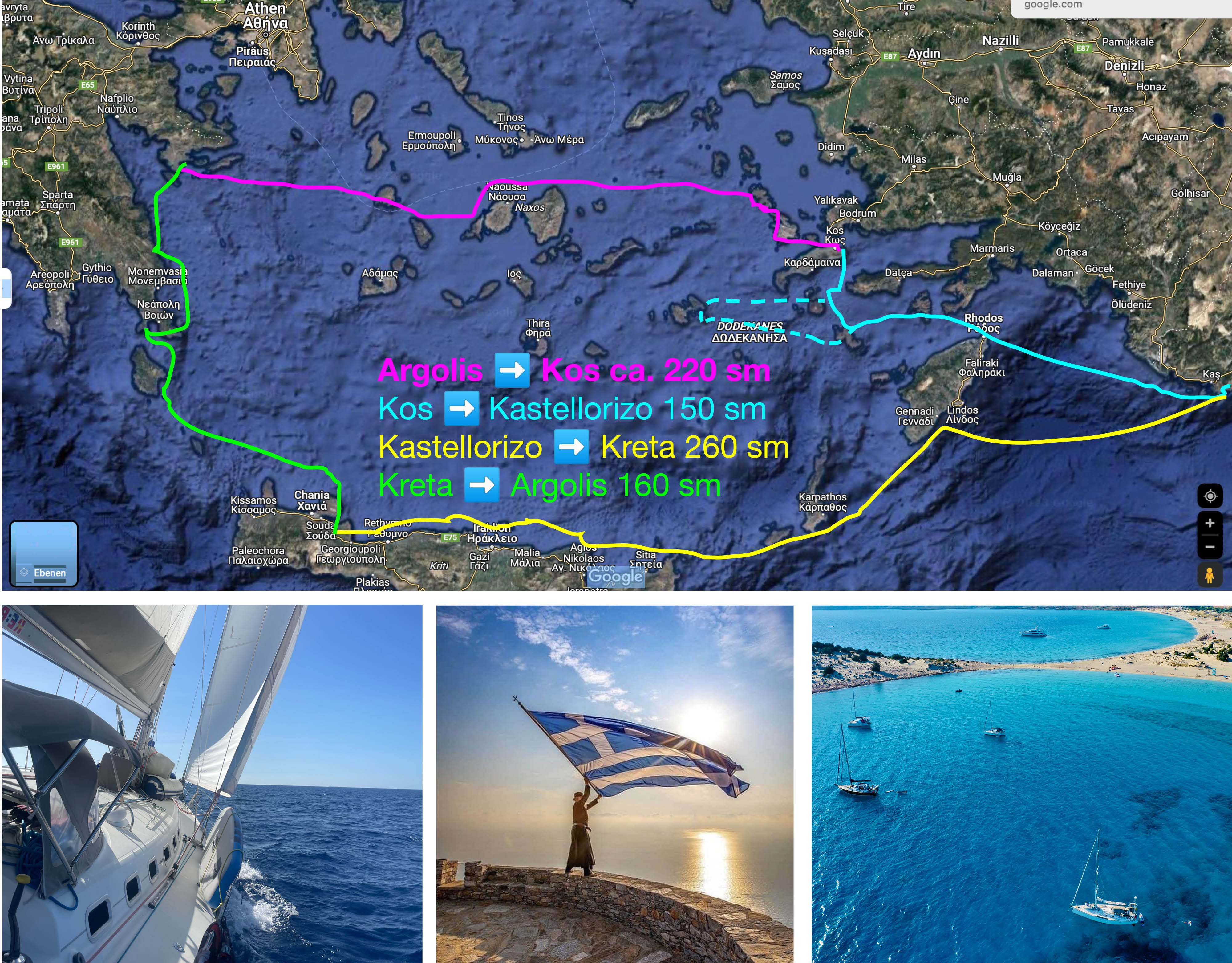 2025 ging es im Frühjahr mit Kurs Ost von den Peleponnes aus durch die Kykladen bei ordentlic Wind aus Nord über Syros, vorbei an Mykonos Patmos und Kalymnos. Dann weiter an der türkischen Küste entlang südlich durch die Dodecanes Kos, Nisyros, Tilos, Symi, Rhodos - weiter auf die entfernteste griechische Insel, nach Kastellorizo. Von dort aus ging es 190 Seemeilen nonstop mit erfahrener Crew bei 0-9 Bft über Nord-Ost Kreta ins wunderschöne Sitia, weiter die Kretische Nordküste östlich entlang, vorbei an Haraklion und Rethmynon mit Abstecher in Monemvasia auf Lakonien wieder zurück auf die Peleponnes.