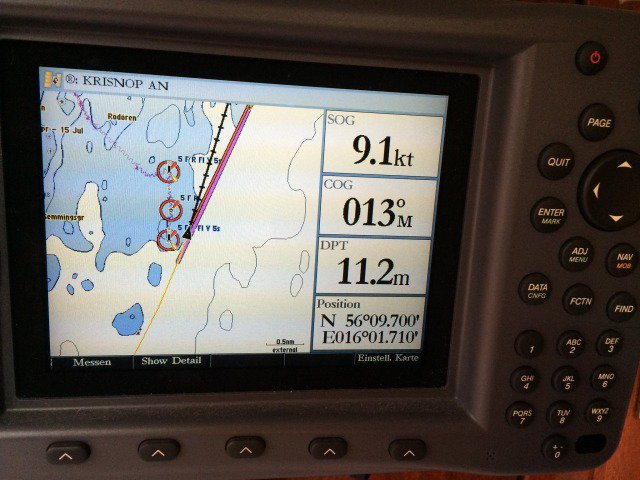Der Biorhythmus ist ja 5:30 Uhr gewohnt, also wieder aufstehen vor dem Aufstehen. Es sollte sich lohnen. Bei sonnigem Halbwind um die 4-5 Bft rauschen wir durch die Hanöbucht nach Schweden, und doch vorbei an Utklippan, weil wir Sorge haben, der nicht ausgebaute DVBT Empfang auf der Aussenschäre könnte die Crewmotivation am Abend des Deutschland WM Achtelfinalspiels negativ beeinflussen. Einem Tip folgend, segeln wir nach Kristianopel, bekommen im kleinen Hafen einen du-du-du Eckensteher Liegeplatz, schön längsseits an der Promenaden Pier, weil die MEER-SEEN zu viel Tiefgang hat. Wir hatten das kommunale Ortskalenderium jedoch nicht im Kopf... Ja, es war Midsummer Ortsfest mit Tombola, Bockwurst vom Grill und der schrecklichsten Live-Band seit Jahren. Und überhaupt, die blonden Schwedinnen in knapper Sommerbekleidung fehlten hier gänzlich... All das könnte uns nicht traurig stimmen, da unser Technik Profi Henning eine, mittels WLAN mit dem IPad verbundene DVBT Antenne im Mast justierte und somit dem WM Achtelfinalabend Deutschland ./. Algerien nichts mehr im Weg stand. Der verfügbare Bluetooth Kanal würde mit der mobilen MEER SEEN BOSE Box verbunden und schon zog Stadionfeeling in unser Cockpit ein. Ok, auf schwedisch, aber dafür kein Bela Rethy ;)