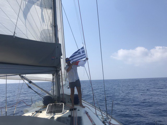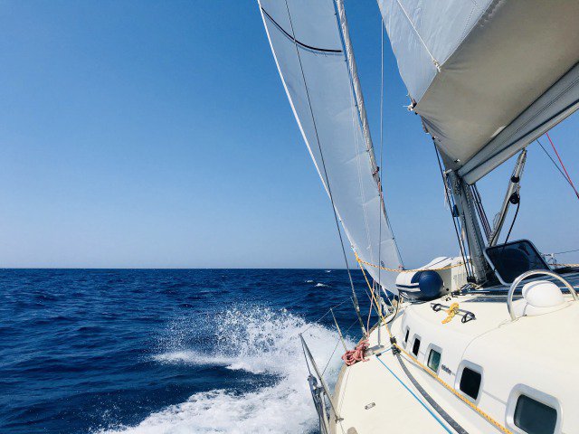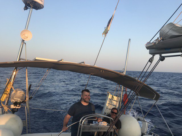 Die mittelfristige Windvorhersage lässt uns leider keinen Tag länger in Griechenland weilen... Freitag früh geht der Anker hoch, vorbei am historischen Methoni Fort Kurs 250 Grad... wir nehmen bei nördlichen Winden mit vorhergesagter W-Drehung 270 Grad und ab geht der Ritt. Abends gibt’s deftigen selbst gemachten Kalbs-Gulasch. Im 2-er Wachsystem á 3 Segler gehen so ziemlich alle Am-Wind Segel hoch und runter, die an Bord sind. Genua-Fock-Genua. Welle 1,5-2 Meter gemäßigt aus NW, einige Brecher schickt uns Italien, aber alles gut zu händeln, der Rumpf der 47.7 passt da anständig rein. Viel Schiffsverkehr aber dank AIS wurde nicht ein Ausweichmanöver nötig und so geht es eher unspektakulär zwischen 5,5 und 8,5 Knoten Speed mit Kurs SE Sizilien im Luv Bogen in die Nacht. Mitternacht haben wir etwas über 80 Meilen auf der Uhr, der Wind nimmt zu und mit 1. Reff und Fock wird es sportlich fix. Samstag wird im Wachsystem weiter gesegelt, gegen Nachmittag lockt Kaffee mit griechischem Kuchen, später dann noch ein Pasta Gericht alle Segler ins Cockpit. Das Boot rauscht durchs Ionische Meer. Immernoch kommt vergleichsweise für das offene Seegebiet wenig Wasser über. Das Etmal (Strecke in 24h) liegt bei 150 Seemeilen, 100% unter Segel – das sind im Schnitt über die 24h Samstag 6,25 Knoten.