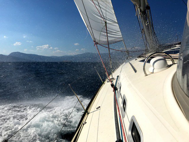 Frühstück, ablegen, Foto- und Filmshooting vor der traumhaft sonnigen Kulisse der City Korfus. Nachdem das Presseboot wieder inkl. Marco an Deck gehievt wurde, gehen wir bei schönem aber wechselhaftem Halbwind weiter zwischen Korfu und griechischem Festland Kurs Süd / Südwest. Es sind wunderschöne Segelstunden. Warm, sonnig, schnell und endlich zuhause im geliebten Griechenland.