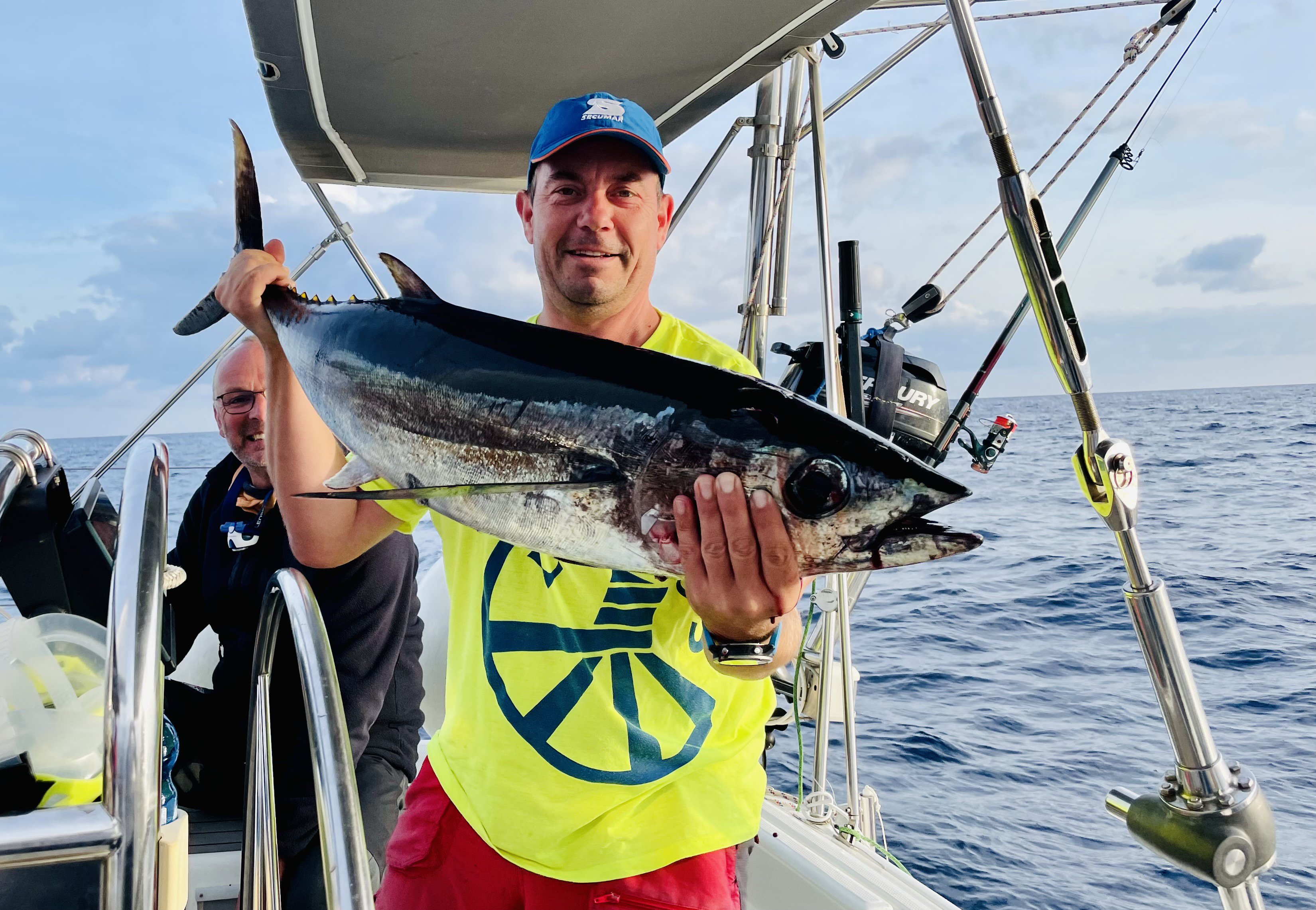 Nach genau einer Stunde Kampf sind die 300 fuss Leine eingeholt. Irgendwann ergibt sich der Gelbflossen-Tuna, Untermaß hat er ganz sicher nicht und ohne Gaff (eine Art Carbon Besen ohne Besen, dafür ein Edelstahl Haken mit sehr spitzem Ende) so ein bisschen wie die Hand von Captain Hook. Fast 1 Meter Fisch - genug für 6 hungrige Männer: 3 Tage. Steak pur. Etwas Feineres kann ein Gaumen wohl nicht geschenkt bekommen.