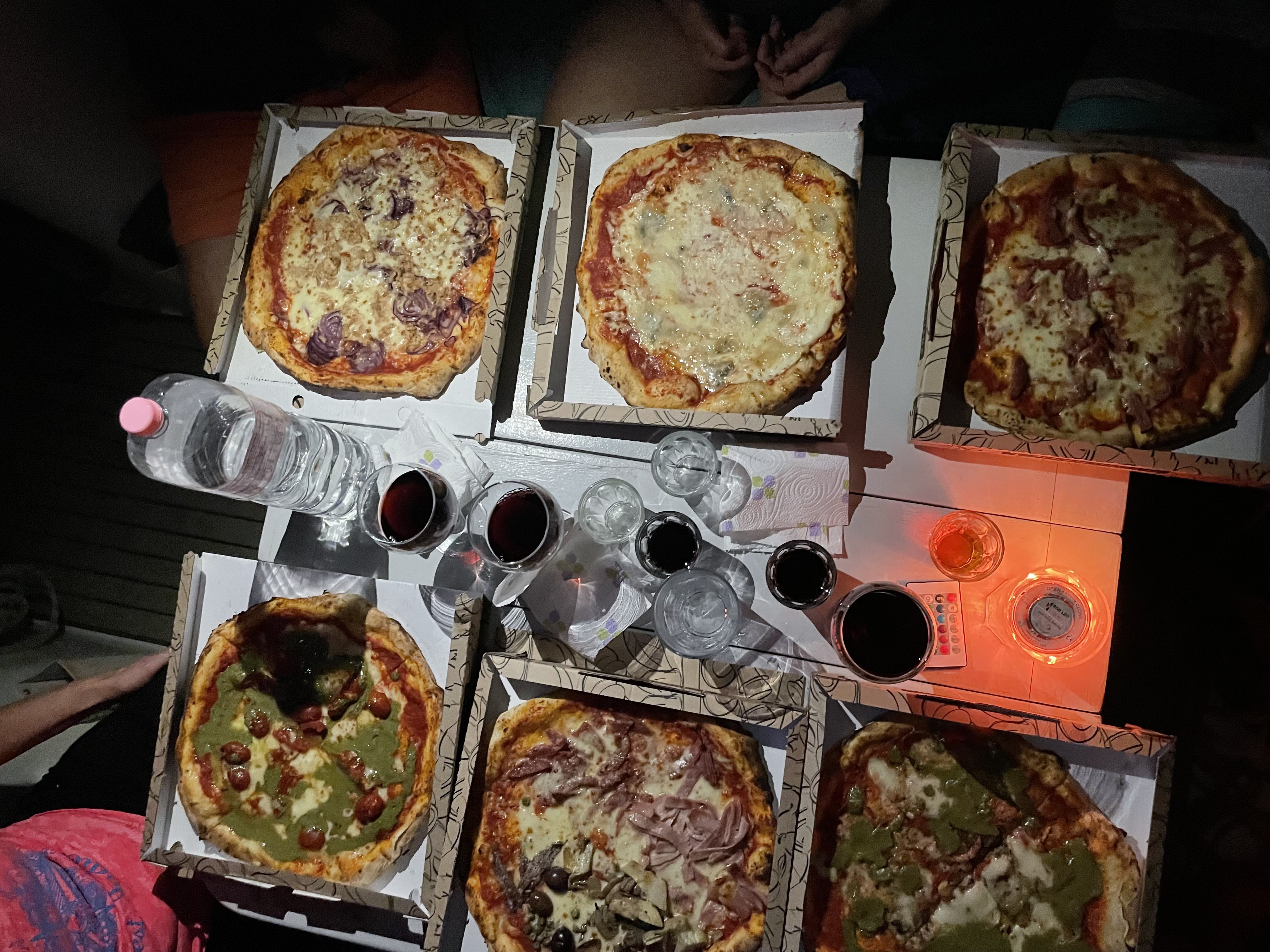 Yachten, Ausflugsboote die darauf warten, an der einzigen Pier im Ort ihre Gäste wieder einzusammeln, die Sonne geht langsam unter. Unsere Mädels setzen mit dem Tender über und besorgen Pizza. Der Ort war nach 18 Uhr wie leer gefegt. Alles atmet auf. Wer jetzt noch als Fremder hier ist, gehört hier her, bleibt länger oder ist ein Boaters vor Anker. Wir bekommen die leckerste - ich schwöre es - Dinghi Lieferpizza der Welt. Würzig mit Pistazien Pesto… einfach Weltklasse. Pizza. Bierchen, Wein.